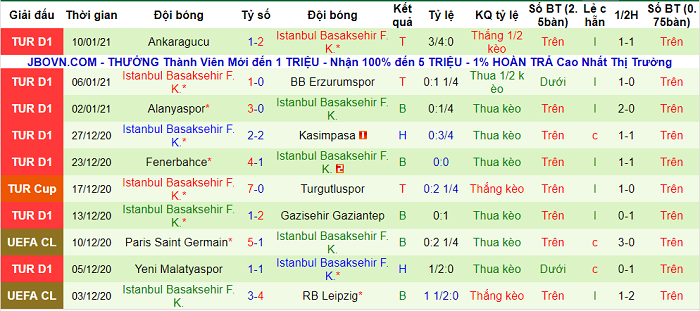 - Thống kê 10 trận gần nhất của Istanbul Basaksehir
