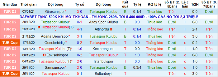 - Thống kê 10 trận gần nhất của Tuzlaspor