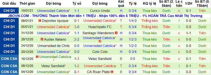 - Thống kê 10 trận gần nhất của Universidad Catolica