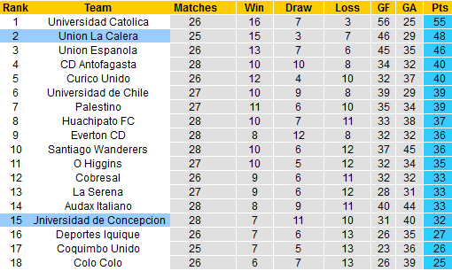 Với sự ổn định cao suốt từ giai đoạn đầu mùa, Union La Calera cho thấy họ đủ sức đua tranh chức vô địch khi đang đứng nhì bảng với 48 điểm, ít hơn đội dẫn đầu 7 điểm nhưng còn 1 trận chưa đấu.