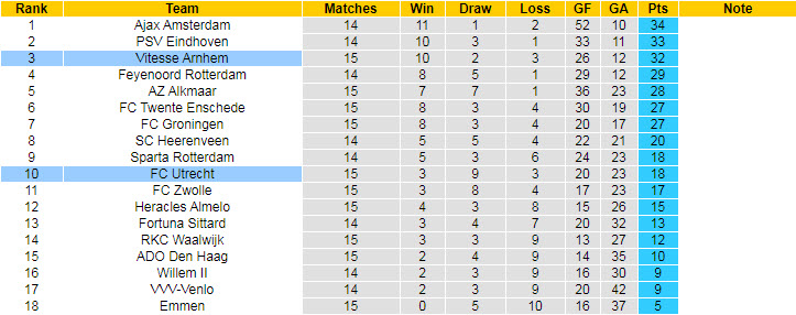 Với đà phong độ thăng tiến và thêm lợi thế được chơi trên sân nhà, Vitesse Arnhem tự tin sẽ giành trọn 3 điểm ở trận đấu sớm vòng 16, và tạm thời leo lên ngôi đầu. Niềm tin của đội chủ sân GelreDome càng gia tăng khi đối thủ chỉ là Utrecht.