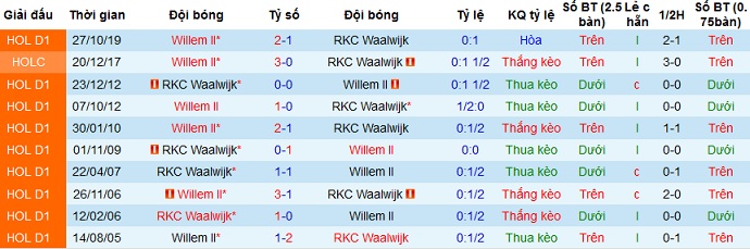 + Soi tỷ lệ kèo châu Á: Tuy được chơi trên sân nhà cũng như đang đứng trên đối thủ nhưng Waalwijk vẫn bị đánh giá là đội cửa dưới cho dù kèo chỉ dao động ở mức +0 và +0,25. Lý do là bởi trong 8 lần gặp nhau trước đó Willem II vẫn đang bất bại trước đội chủ nhà, với 6 lần thắng và chỉ để hòa 2 trận.