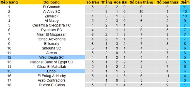 Bảng xếp hạng giải VĐQG Ai Cập trước vòng 6