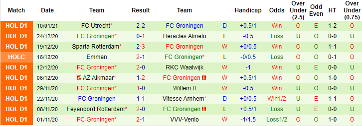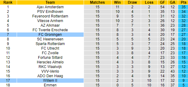 Đối thủ của Willem II ở trận đấu sắp tới là Groningen đã giành được 27 điểm sau 15 trận, xếp thứ 7 trên bảng xếp hạng. Trên sân khách, Groningen đang rất tự tin cùng chuỗi 3 trận bất bại liên tiếp gần đây tại giải VĐQG Hà Lan (thắng 2, hòa 1). 8 lần gần đây làm khách trên sân của Willem II, Groningen bất bại 6 lần với 4 chiến thắng và 2 trận hòa.