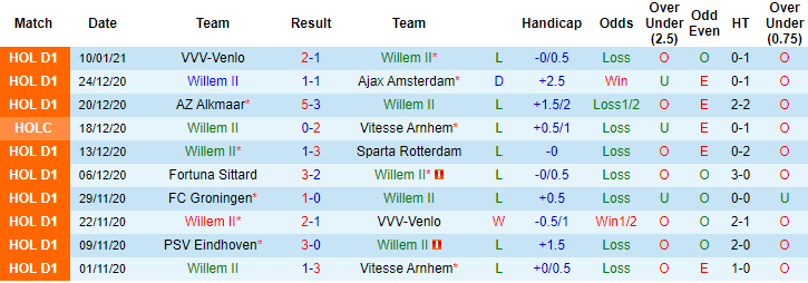 Willem II có khởi đầu tốt tại giải VĐQG Hà Lan mùa này. Tuy nhiên giai đoạn gần đây họ thi đấu sa sút không phanh vì lực lượng sứt mẻ. 7 trận liên tiếp vừa qua Willem II không biết đến mùi chiến thắng, trong đó có 6 thất bại. Trên bảng xếp hạng lúc này, Willem II đã tụt xuống vị trí thứ 2 từ dưới lên với vỏn vẹn 9 điểm sau 15 trận.
