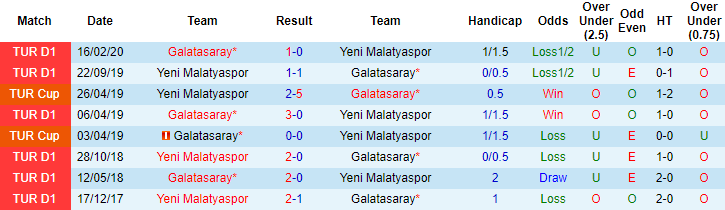 Lần gần nhất đối đầu nhau tại Cúp quốc gia Thổ Nhĩ Kỳ, Yeni Malatyaspor bị Galatasaray đánh bại với tỷ số 2-5 ngay trên sân nhà. Lần tái đấu sắp tới cũng thuộc khuôn khổ Cúp quốc gia, Yeni Malatyaspor mang đến nhiều hứa hẹn vào khả năng "đòi nợ" đối thủ.