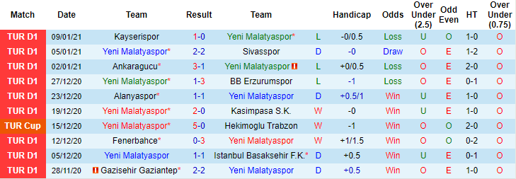 + Thống kê 10 trận gần nhất của Yeni Malatyaspor