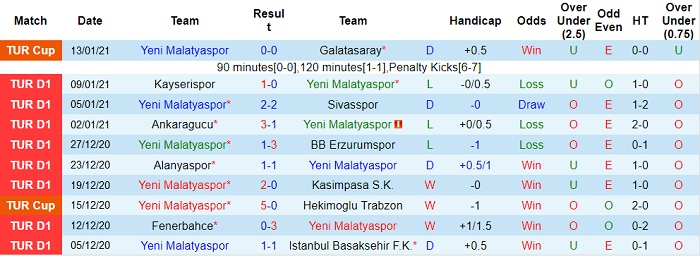 - Thống kê 10 trận gần nhất của Yeni Malatyaspor