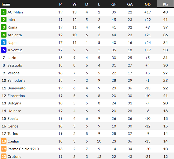 Bảng xếp hạng Serie A 2020/21 mới nhất