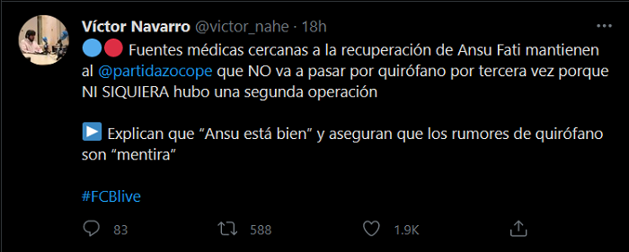 Tuy nhiên, theo nhà báo Victor Navarro của COPE, Ansu Fati sẽ không phải phẫu thuật lần 3. Nhà báo này viết trên trang twitter cá nhân như sau:
