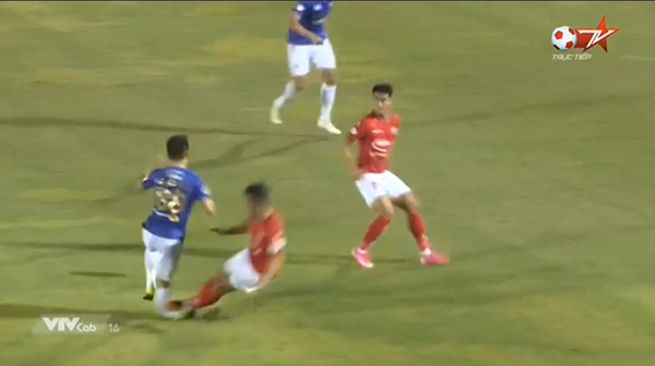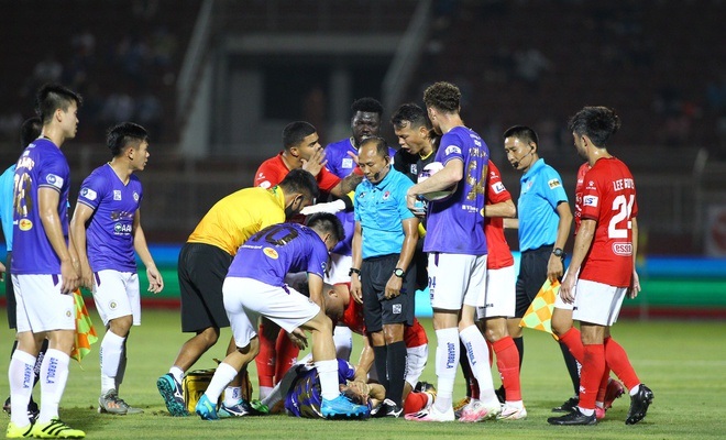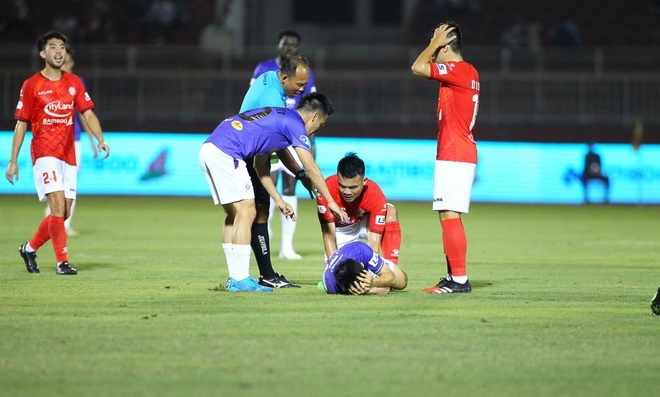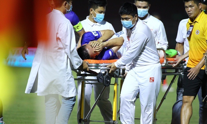 Pha quay chậm cho thấy, chân phải của Quả bóng vàng Việt Nam 2019 gần như đã gãy gập. Các bác sĩ nhanh chóng vào sân sơ cứu rồi chuyển thẳng Hùng Dũng ra xé cứu thương.