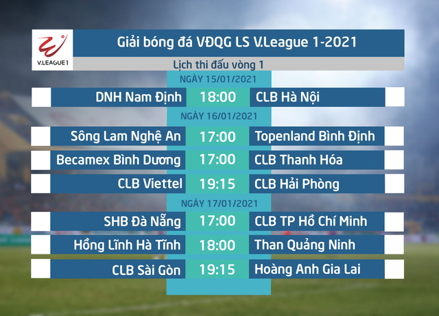 Trận mở màn V-League 2021 là cuộc so tài giữa Nam Định vs Hà Nội FC trên sân Thiên Trường, lúc 18h00 thứ Sáu, ngày 15/1. Dưới đây là lịch thi đấu chi tiết vòng 1.