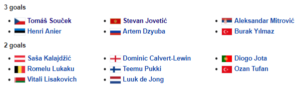 8 cầu thủ đã ghi được 2 bàn thắng, trong đó có Romelu Lukaku của ĐT Bỉ, Diego Jota của Bồ Đào Nha. Dominic Calvert-Lewin đứng trước cơ hội vượt lên khi vào đêm nay ĐT Anh thi đấu lượt trận thứ 2 gặp chủ nhà Albania.